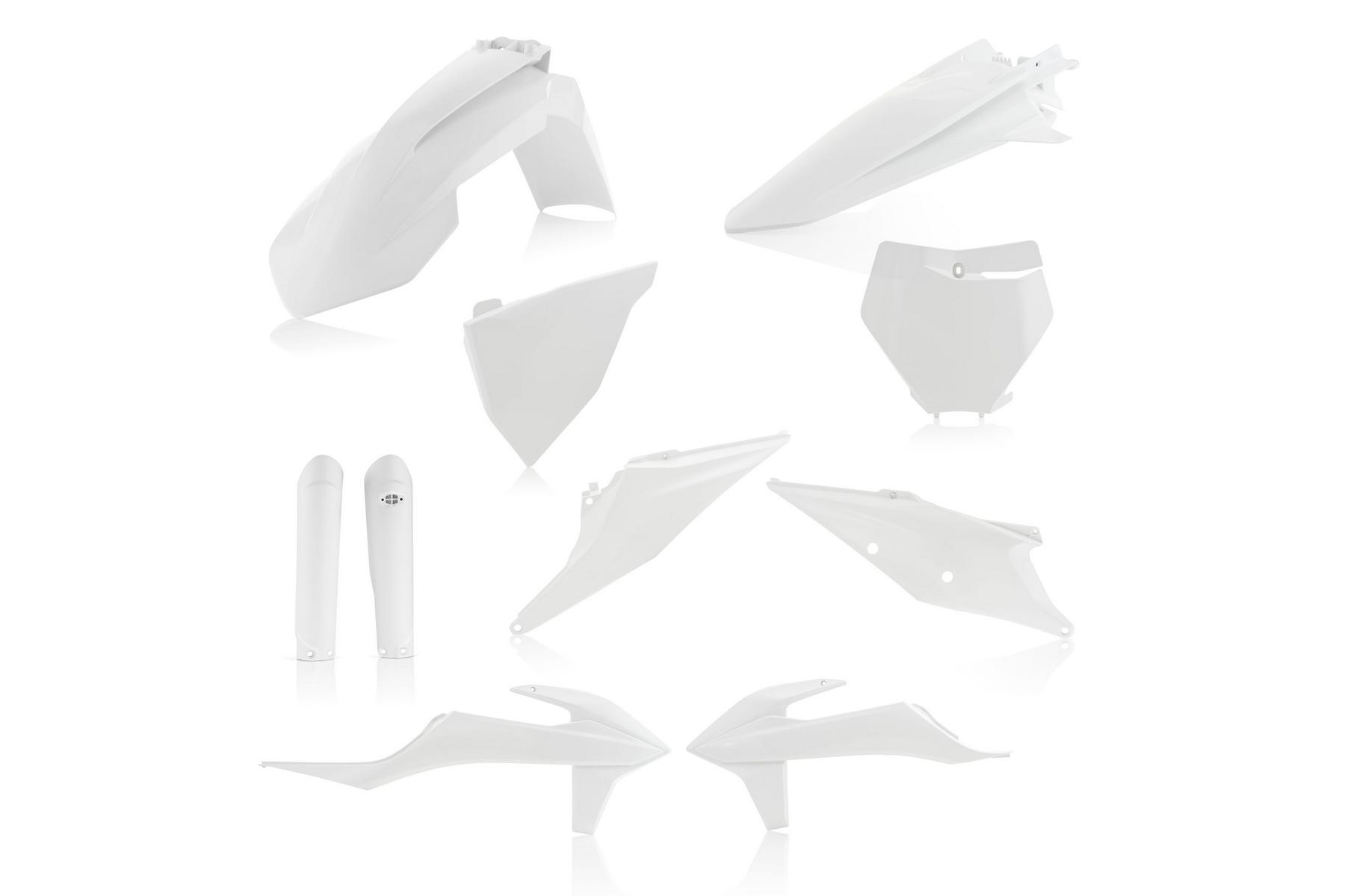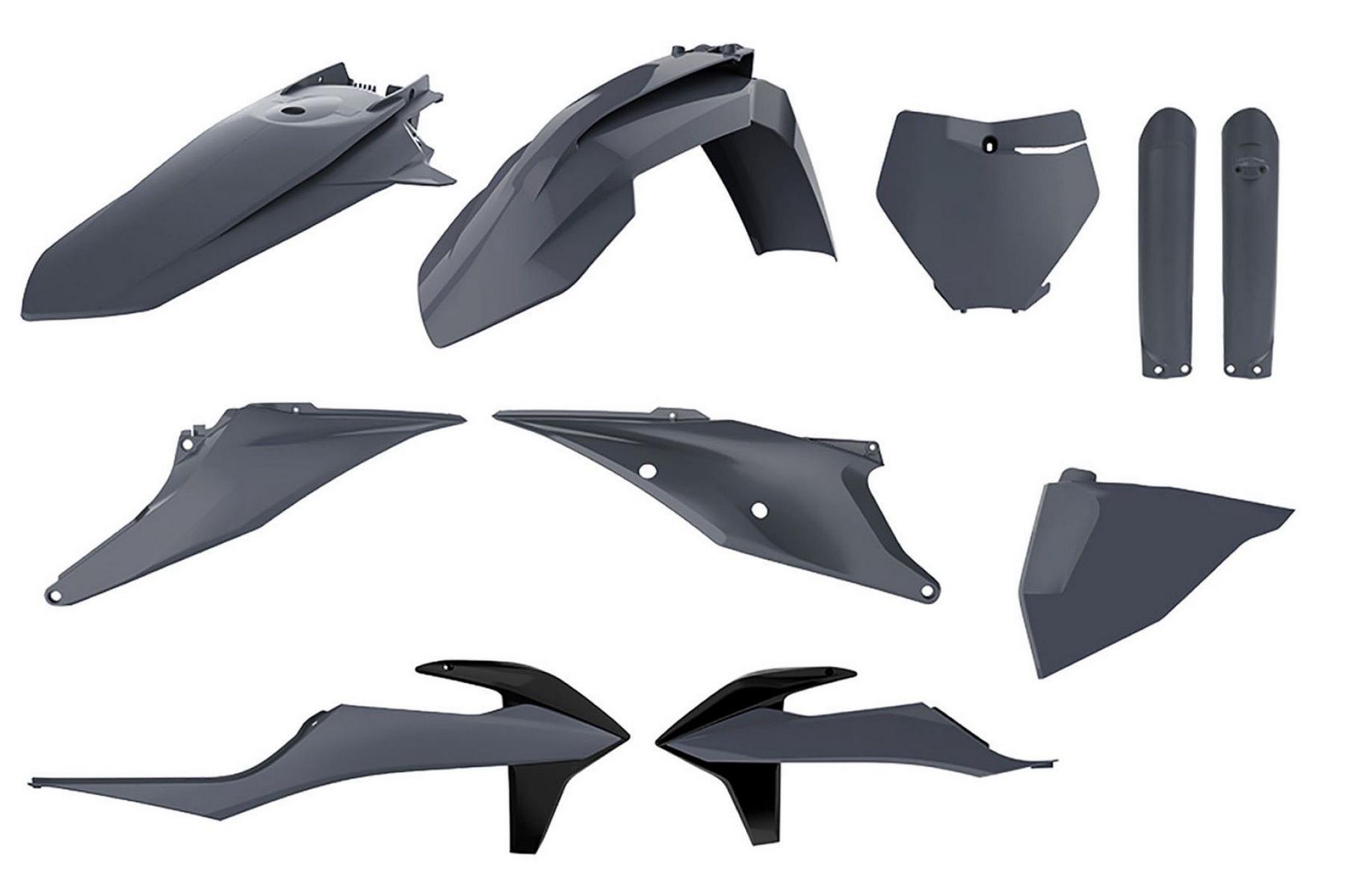 Dans le kit, tu as : le garde-boue avant, le garde-boue arrière, les caches latéraux, le cache de radiateur, la plaque porte-numéro avec masque de phare, le cache boîte à air et la protection de fourche. Tu peux aussi acheter chaque pièce séparément si besoin.